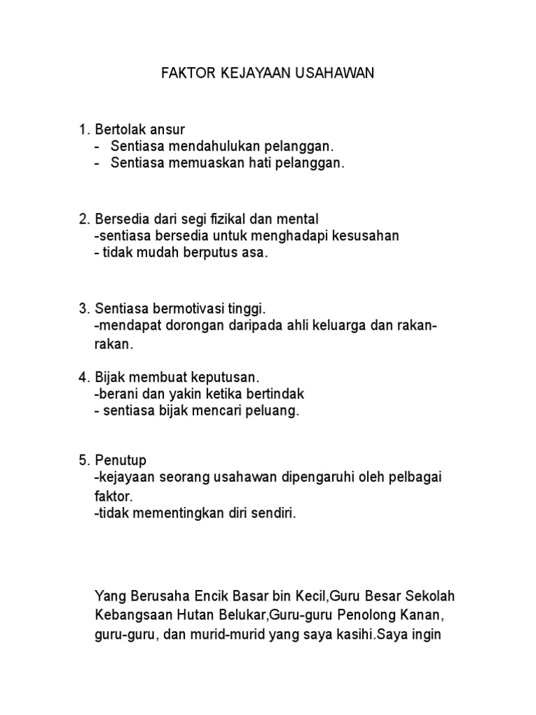 Ciri ciri usahawan berjaya karangan. Usahawan yang kreatif merupakan usahawan yang banyak idea panjang akal dan berupaya menghasilkan produk baru dan canggih serta unik. Seorang usahawan yang berjaya pada abad ke 21 pada masa kini perlu mempunyai maklumat terkini supaya perniagaannya tidak ketinggalan dengan pesaing pesaing mereka. Saya akan mula menerangkan tentang ciri ciri seorang uasahawan yang berjaya yang pertama tidak boleh berputus asa walaupun banyak kerugian yang kita alami ini bukan bermakna kita gagal dalam menjadi seorang usahawan tetapi ini adalah satu ujian kepada kita untuk tidak berputus asa. Setiap individu berpeluang untuk mengecapi kejayaan sebagai seorang usahawan kerana ciri ciri keusahawanan yang ada pada kebanyakan usahawan bukanlah dilahirkan secara semula jadi tetapi adalah disebabkan faktor faktor seperti mempunyai daya inisiatif dan kejayaan yang tinggi lokus kawalan dalaman yang tinggi serta berkeyakinan terhadap kebolehan dirilah yang menjadikan mereka berjaya.