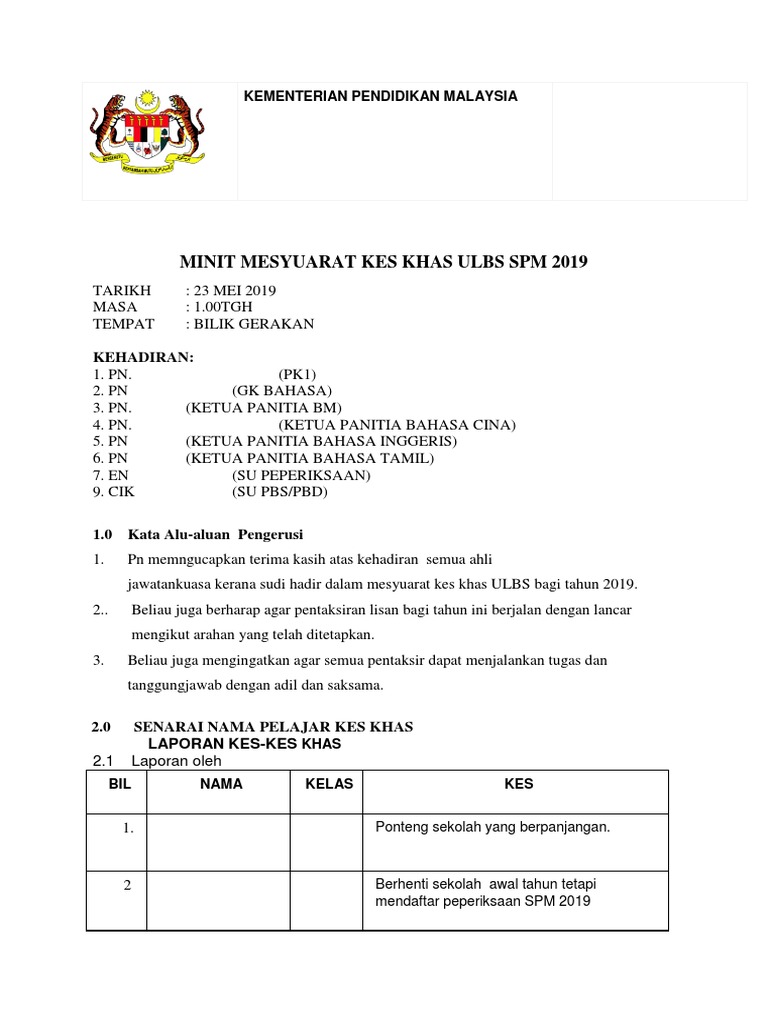 Minit Mesyuarat Kes Khas Ulbs Spm 2019