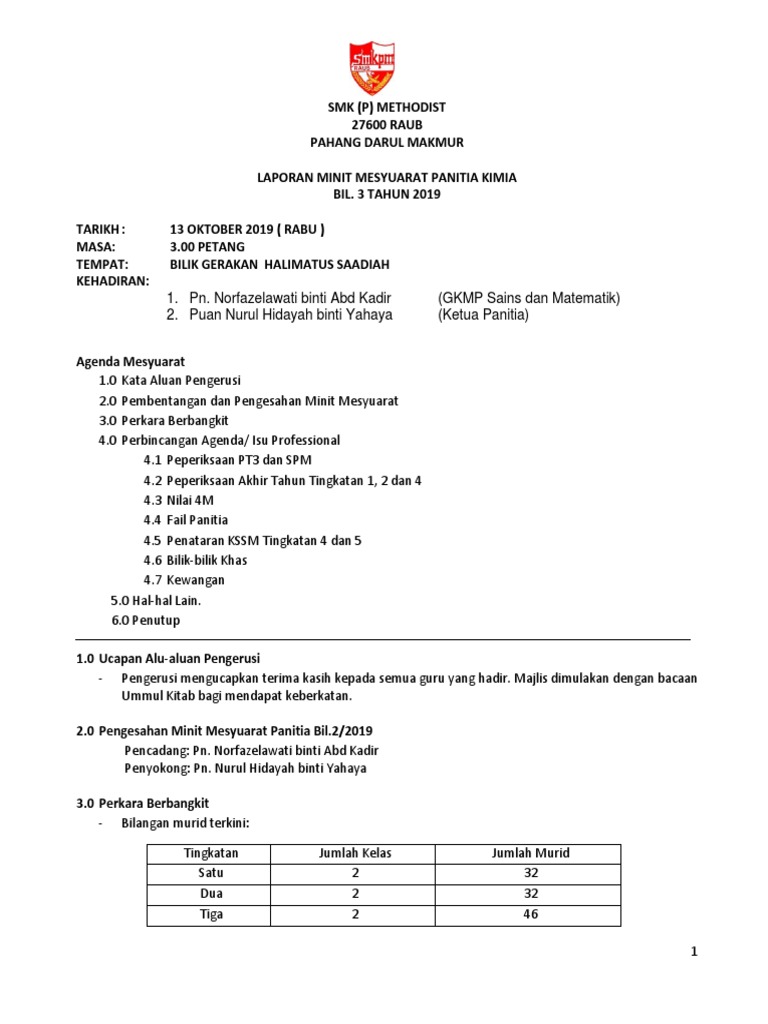 Minit Mesyuarat Jawatankuasa Rmt Bil 1 2019 Docx