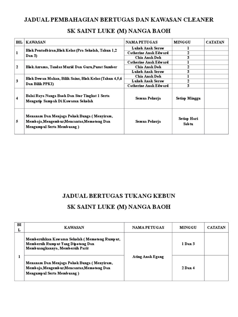 Kebersihan Contoh Jadual Bertugas Pekerja